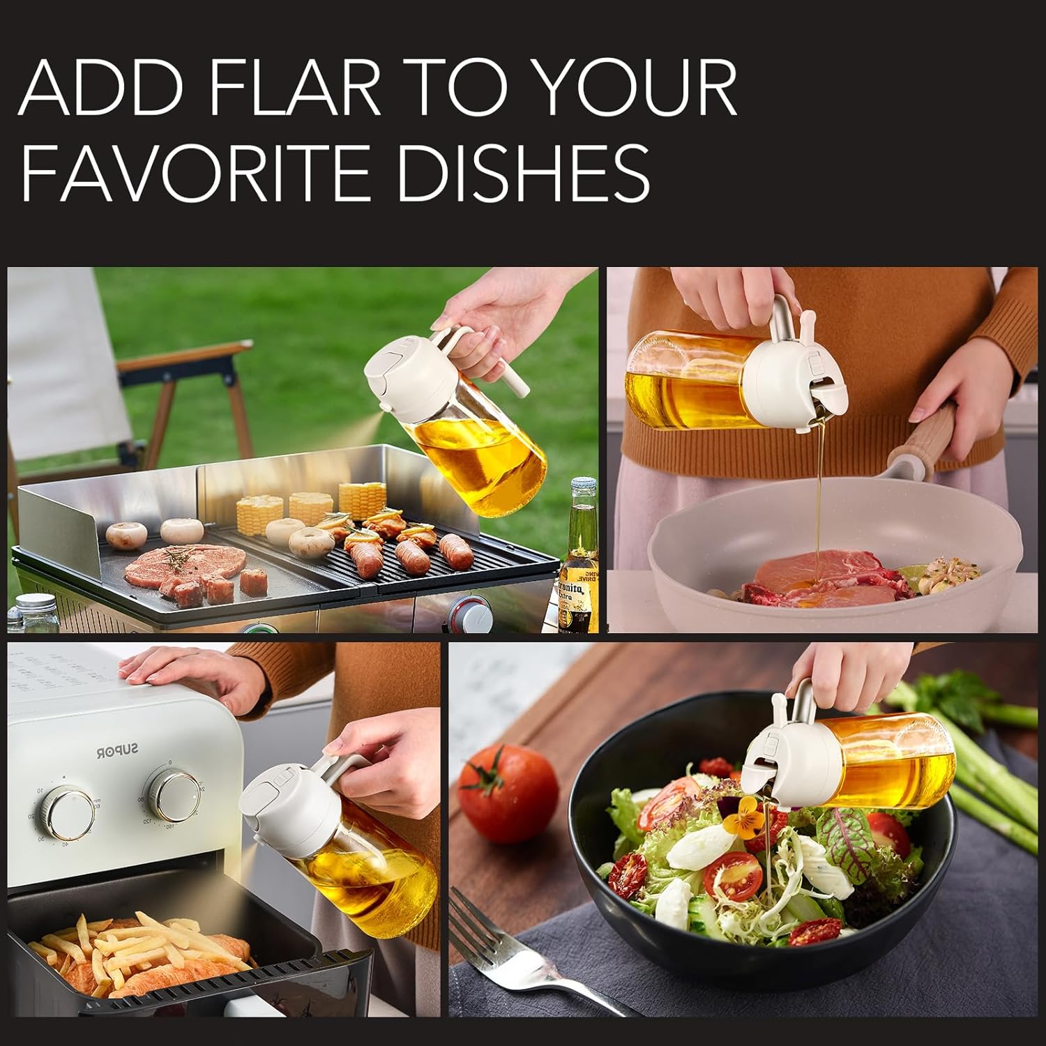 🍾 Dual-function Design & Multi-purpose: Oil spray bottle for cooking offers the convenience of both spraying and pouring oil, suitable for a wide range of food preparation processes such as dressing, griddle, roasting, grilling, baking