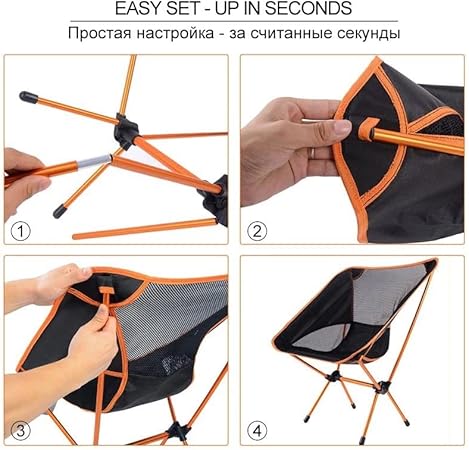 Easy to install and clean : Well structured four legs and foldable mesh, make it easy to set up and fold down, within one minute you can finish the assembly process.This portable chair is compact enough to put into your backpack or your carry-on luggage. The camping chair is also very easy to clean, you only need to clean with soap and water